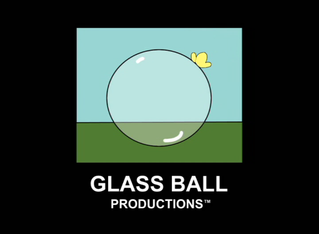 Logo: On a black background, there is a box with a glass ball on a grassy field. The words "GLASS BALL" and the smaller "PRODUCTIONS" are shown at the bottom. A yellow butterfly then appears and touches the ball, causing it to break into smithereens.
